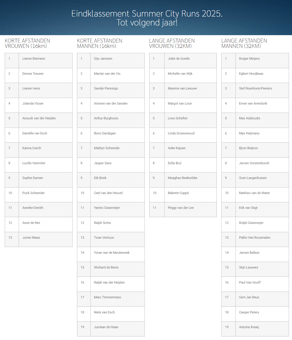 Wat is het ieder jaar een spannende ontknoping van de 073 Summer City Runs! 3 hardloopwedstrijden, 3 keer knallen en dan in het klassement worden opgenomen. In het eindklassement hierboven staan alle winnaars van 2025. Diepe buiging voor jullie prestaties!